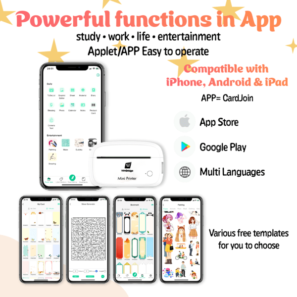 • 【Powerful Bluetooth Printer】Small printer is compatible with iPhone, Android & iPad devices. Pocket printer does not need a Wi-Fi connection, just connect it via Bluetooth. The accompanying app offers powerful functionality and user-friendly operation. With a built-in free editor, you can freely edit and easily create custom greeting cards, study cards, game cards and more. Unleash your creativity with our Mini Card Printer and bring your ideas to life effortlessly.