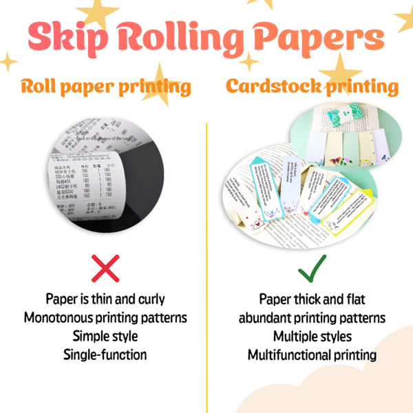 • 【Unique plug-in card design】Mini Printer is designed for effortless cardstock insertion and printing, freeing you from the hassle of paper rolls. Enjoy the convenience and simplicity of our unique plug-in card design, making printing a breeze.