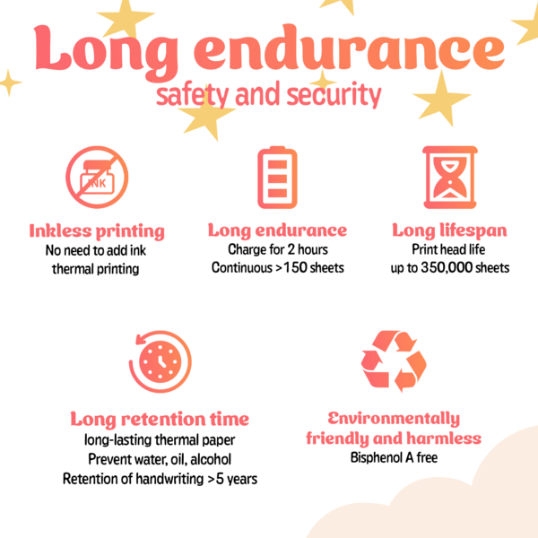 • 【Long-lasting battery】The mini portable printer has a 1000mAh rechargeable built-in battery for long-lasting use. The printer only needs 2 hours to fully charge and can continuously print at least 150 sheets of cardstock. Meet your outdoor printing needs and be able to print easily anytime, anywhere.